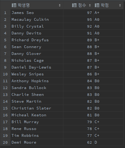 예제 -- student 테이블과 score 테이블, hakjum 테이블 조회하여 학생들의 이름과 점수, 학점 출력
