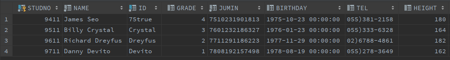 select * from student where deptno1=101; -- 101번이 몇명인지 확인해보기