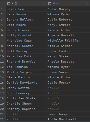 from student s RIGHT OUTER JOIN professor p -- =을 기준으로 데이터가 있는 오른쪽 방향으로 아우터 조인