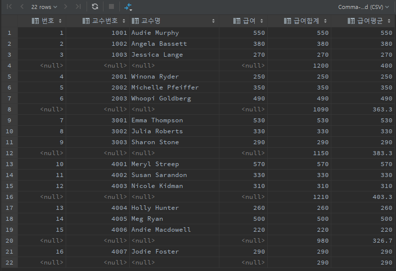 select num 번호, profno 교수번호, NAME 교수명, pay 급여, sum(pay) 급여합계, round(AVG(pay), 1) 급여평균