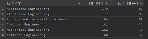 select d.dname 학과명, s.max_height 최대키, s.max_weight 최대몸무게