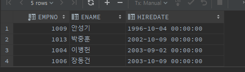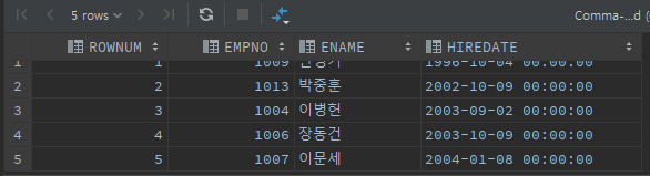 -- 인라인뷰로 입사일이 빠른 사람만 5명만 출력하기