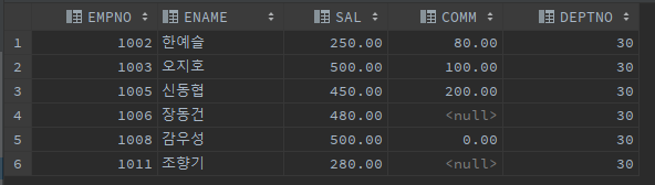 select empno, ename, sal, comm, deptno from emp_copy where deptno=30;