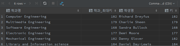 5. student테이블과 departmemt테이블을 사용하여 학과 이름, 학과별 최대키, 학과별로