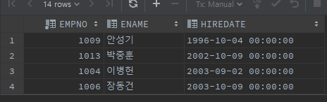 from (select empno, ename, hiredate from emp order by HIREDATE ) ve -- ve = 별칭