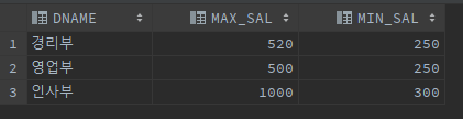 SELECT D.DNAME, MAX(E.SAL) MAX_SAL, MIN(E.SAL) MIN_SAL