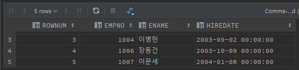 where ROWNUM between 1 and 5; -- 1~5까지의 범위 지정 ( >= | <= )