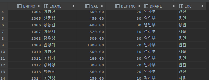 1. 사원 테이블을 기본 테이블로 하여 부서별